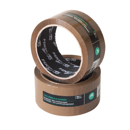La cinta adhesiva de embalaje de color marrón es adecuada para cerrar todo tipo de cajas de cartón; tanto parar uso manual, como automático. Gracias a su potente adhesivo, puede ser utilizada en cajas de cartón reciclado. Presenta un excelente tack para amplia variedad de usos. Soporta condiciones extremas de temperatura y humedad. Usa un adhesivo solvente, caucho sintético y resinas de hidrocarburos. Tiene una adhesión sobre el acero de 1.9N/cm, y una resistencia a la tracción de 38N/cm. El material de soporte es PP biorientado transparente, con un espesor de 25 Micras.
